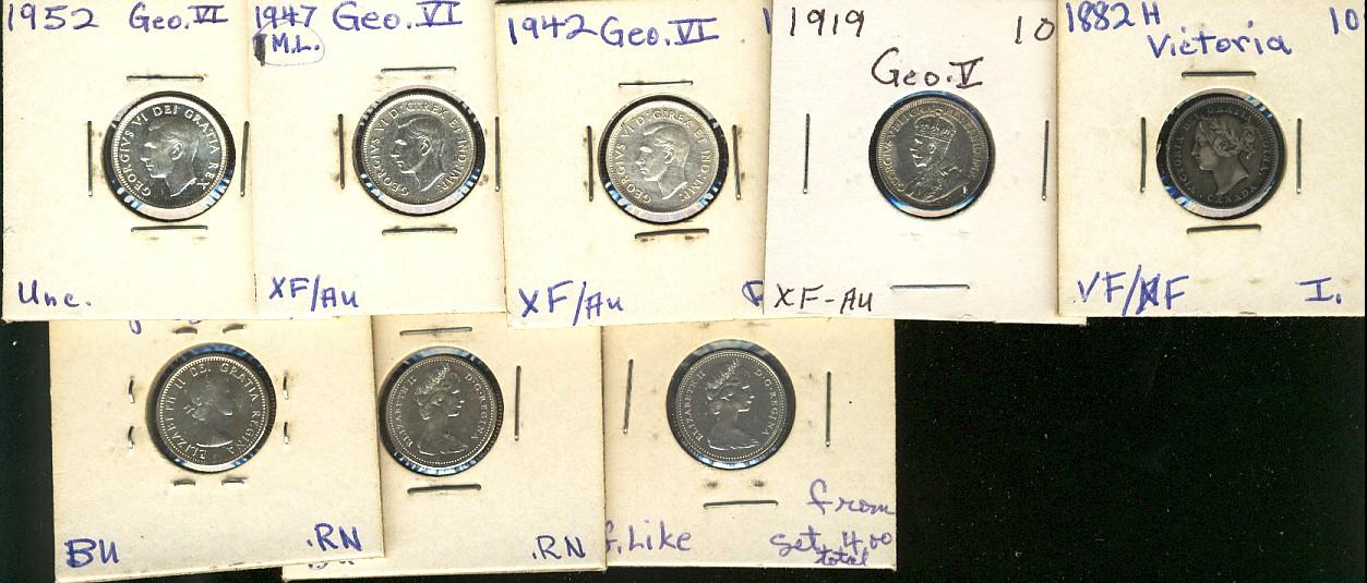 1882H to 1967 10¢. Lot includes 1882H F+, 1919 EF, 1942, 1947ML, 1952, 1964, 1965 & 1967. EF to UNC.