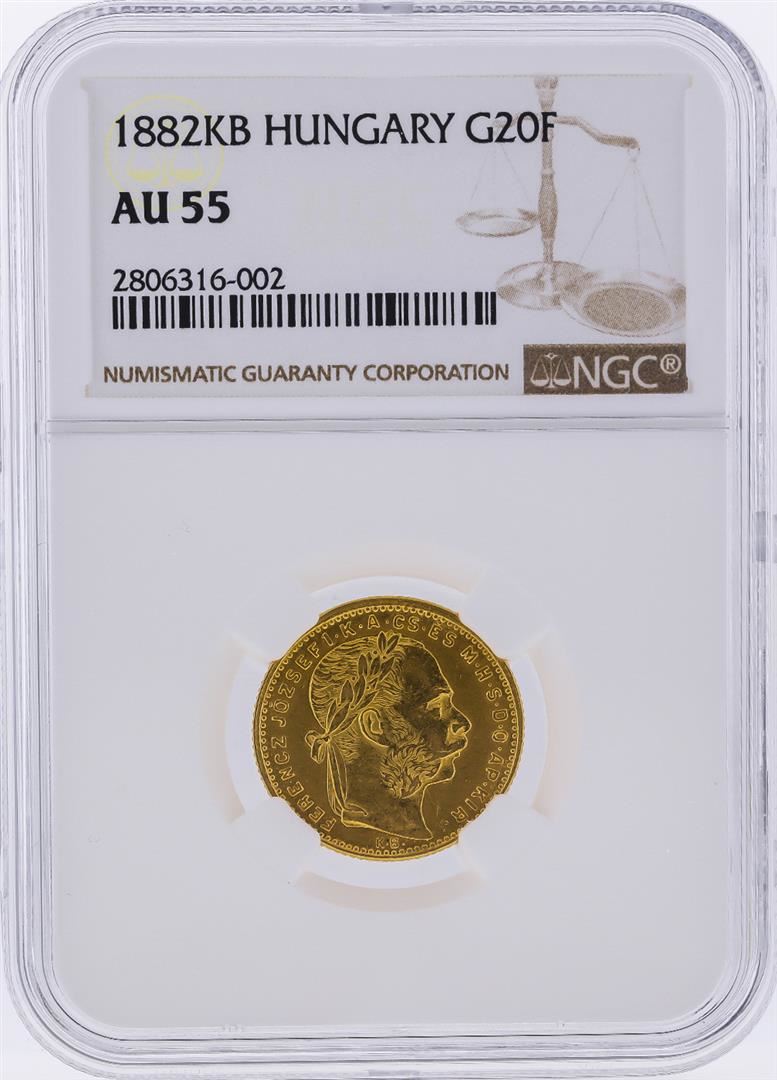 One 1882KB 20 Francs Gold Coin NGC Graded AU55. NGC Certified.
