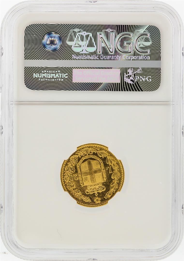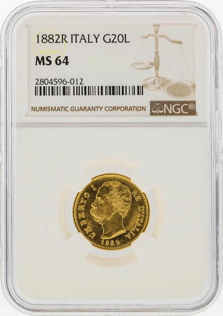 One 1882R 20 Lira Italy Gold Coin NGC MS64. NGC Certified.