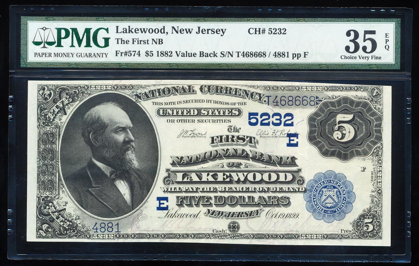 One 1882VB $5 NB of Lakewood, NJ CH# 5232 National Bank Note PMG Choice Very Fine 35EPQ. PMG Certified.