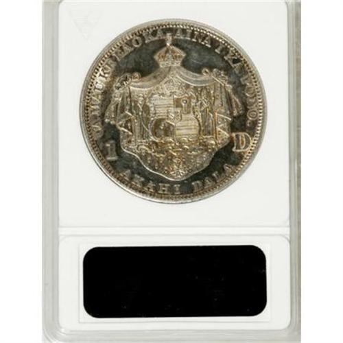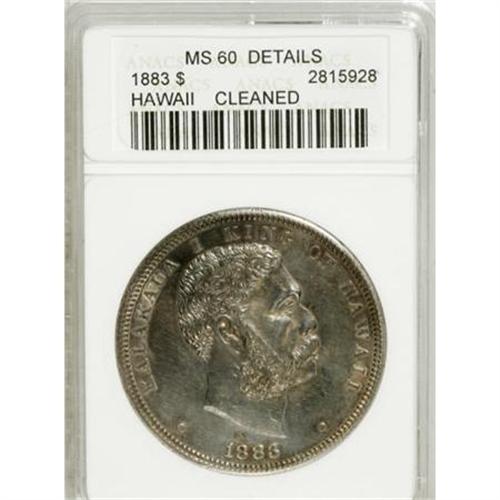 <B>1883 $1 Hawaii Dollar--Cleaned--ANACS. MS60 Details.</B></I> Blushes of golden-brown and electric-blue color frequent this sharply struck example. Faint vertical hairlines are noted the obverse. Still, an attractive example of this elusive issue, the largest of the Hawaiian denominations.<BR><BR><b>Shipping:</b> Coins & Currency (<a target="_blank" href="http://www.heritageauctions.com/common/shipping.php">view shipping information</a>)