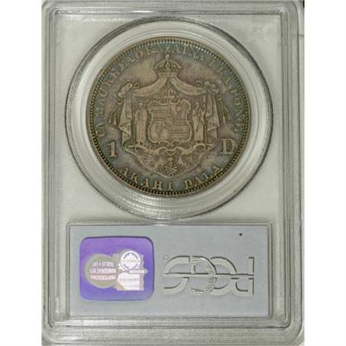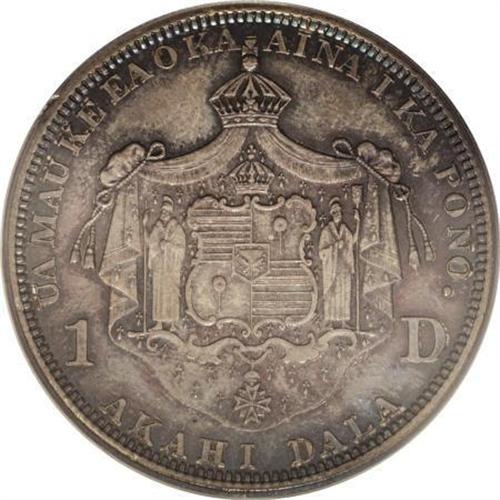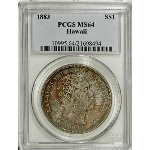 <B>1883 $1 Hawaii Dollar MS64 PCGS.</B></I> Walter Breen (1988) writes of the 1883 Hawaii dollar: "... in 1883 Claus Spreckels (banker, sugar tycoon, and power behind the thrown) came to the King (Kalakaua I) with a proposal to have the United States strike silver coins for the Islands. Conveniently, an Act of Jan. 29, 1874 had already authorized the federal mints to strike coins for foreign countries. Under its terms, the royal government formally applied to have 1 million Dala coined in silver." Breen continues to say that the original mintage consisted of 500,000 pieces less 453,622 melted. It is the key to the 1883 Hawaii business strike series.<BR> The lustrous surfaces of this near-Gem example consist of an array of purple, violet, forest and apple-green, and red-orange toning on the obverse, and lavender and sky-blue coloration on the reverse. The strike is impressive, leaving strong definition on all of the design elements. The surfaces on both sides are well preserved. Population: 20 in 64, 12 finer (7/07).<BR><BR><b>Shipping:</b> Coins & Currency (<a target="_blank" href="http://www.heritageauctions.com/common/shipping.php">view shipping information</a>)