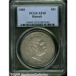 <B>1883<img border='0' src='http://www.heritagecoins.com/images/star.gif' width=10 height=10>$1 Hawaii Dollar XF45 PCGS.</B></I> This is a lightly circulated, yet attractive example with silver-gray toning. Well defined overall with no singularly mentionable marks. This is popular issue, a product of the San Francisco Mint, and an association item for a collection of American coinage.