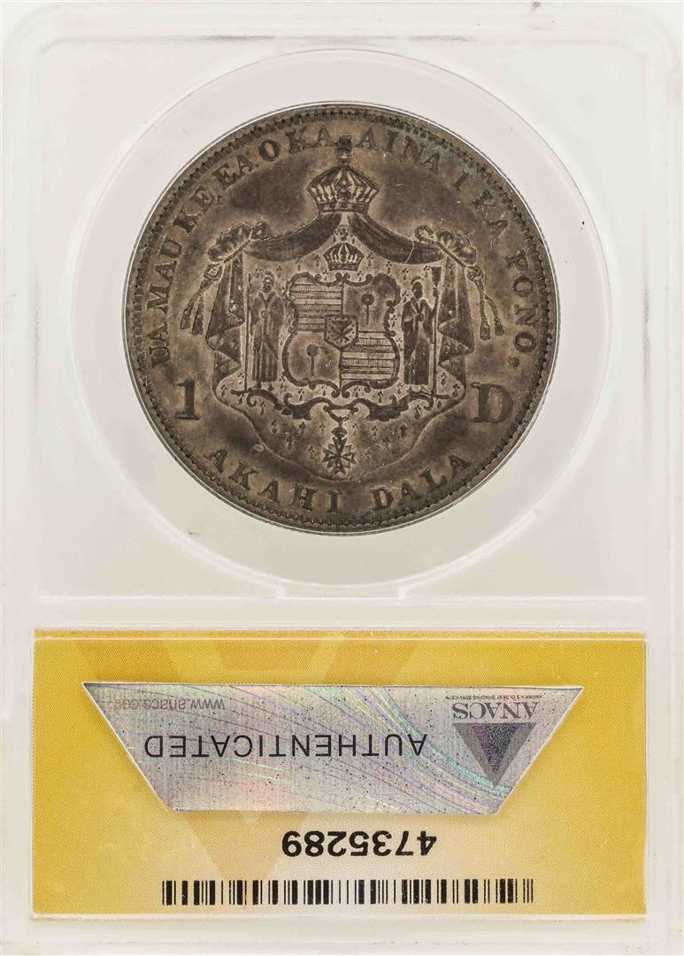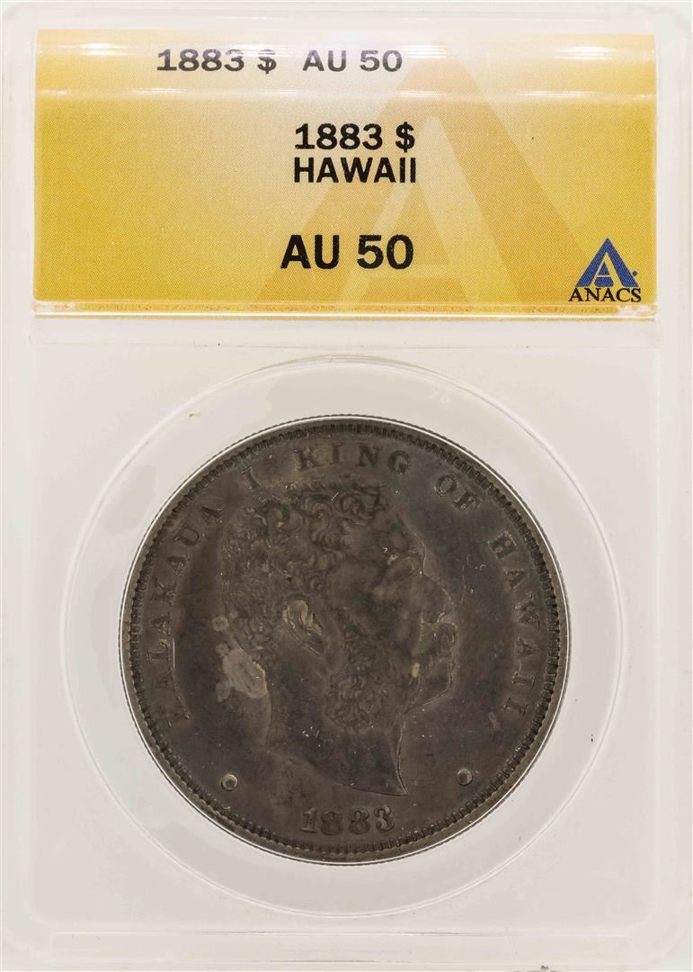 One 1883 $1 Kingdom of Hawaii Dollar Coin ANACS AU50. ANACS Appraised.