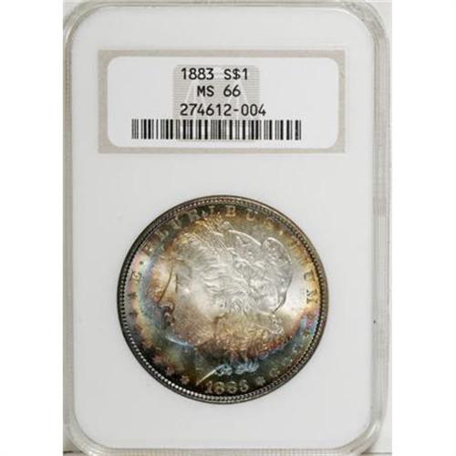 <B>1883 $1 MS66 NGC.</B></I> Outrageously toned on both sides with vivid bands of violet, rose, electric-blue, and golden-brown patina. A lustrous Gem with a good strike and well preserved surfaces.<BR><BR><B>Coin Engraver:</B> George T. Morgan<BR><BR><b>Shipping:</b> Coins & Currency (<a target="_blank" href="http://www.heritageauctions.com/common/shipping.php">view shipping information</a>)