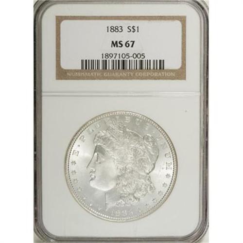 <B>1883 $1 MS67 NGC.</B></I> The brilliant, snow-white surfaces display intense mint frost and glittering cartwheel effects in the fields. Sharply struck and remarkably well preserved. A gorgeous and conditionally scarce Superb Gem. Census: 94 in 67, 2 finer (6/07). <BR><I>From the Reuben Reinstein Collection.</B></I><BR><BR><b>Shipping:</b> Coins & Currency (<a target="_blank" href="http://www.heritageauctions.com/common/shipping.php">view shipping information</a>)