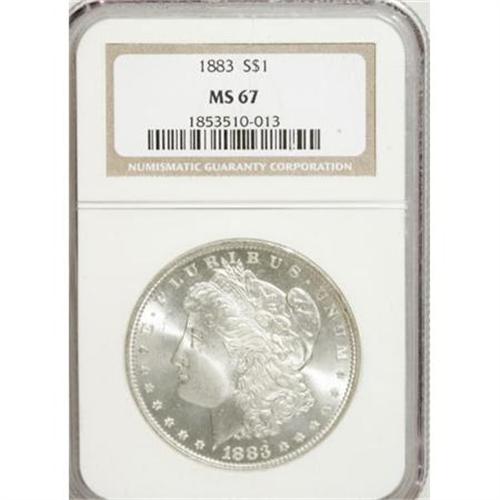 <B>1883 $1 MS67 NGC.</B></I> The richly frosted devices offer a measure of contrast with the minimally toned and faintly reflective fields. Boldly impressed with excellent flash and eye appeal, a striking Superb Gem.<BR><BR><B>Coin Engraver:</B> George T. Morgan<BR><BR><b>Shipping:</b> Coins & Currency (<a target="_blank" href="http://www.heritageauctions.com/common/shipping.php">view shipping information</a>)