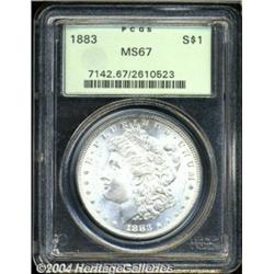 <table><tbody><tr><td><table> <TR><TD width="100%"><TABLE cellSpacing=1 cellPadding=3 width="100%" border=0><TBODY><TR><TD width="100%" bgColor=#79735c><FONT face=arial color=#ffffff size=3><B>Description</B> </FONT></TD></TR><TR><TD width="100%" bgColor=#ffffff><FONT face=arial size=2><B>1883 $1 MS67 PCGS.</B></I> Brilliant throughout, the vibrant mint frost is virtually unscathed by abrasions or luster scrapes. An exceptional '83-P Dollar that is much scarcer in this superior condition than its Carson City and New Orleans counterparts. Population: 41 in 67, 2 finer (10/03).<BR><I>From the Dylan Elijah Collection of Morgan Dollars.</B></I> </FONT></TD></TR></TBODY></TABLE></TD></TR></TBODY></TABLE><BR><A name=PricesRealized></A><TABLE cellSpacing=0 cellPadding=0 width="100%" bgColor=#000000 border=0><TBODY><TR><TD width="100%"><TABLE cellSpacing=1 cellPadding=3 width="100%" border=0><TBODY><TR><TD width="100%" bgColor=#79735c><A name=PR><FONT face=arial color=#ffffff size=3><B>Previous Prices from Heritage Auctions</B> </FONT></A></TD></TR><TR><TD bgColor=#f6f6ed><TABLE cellSpacing=0 cellPadding=0 width="100%" border=1><TBODY><TR><TD align=middle width="33%"><B>Date</B></TD><TD align=middle width="33%"><B>Service</B></TD><TD align=middle width="33%"><B>Price</B></TD></TR><TR bgColor=whitesmoke><TD width="33%"><B>11/11/2003</B></TD><TD width="33%">NGC</TD><TD width="33%">$1,610.00</TD></TR><TR bgColor=whitesmoke><TD width="33%"><B>08/26/2003</B></TD><TD width="33%">PCGS</TD><TD width="33%">$1,897.50</TD></TR><TR bgColor=whitesmoke><TD width="33%"><B>05/03/2003</B></TD><TD width="33%">NGC</TD><TD width="33%">$1,610.00</TD></TR><TR bgColor=whitesmoke><TD width="33%"><B>03/01/2003</B></TD><TD width="33%">PCGS</TD><TD width="33%">$1,897.50</TD></TR><TR bgColor=whitesmoke><TD width="33%"><B>01/12/2002</B></TD><TD width="33%">PCGS</TD><TD width="33%">$1,782.50</TD></TR><TR bgColor=whitesmoke><TD width="33%"><B>11/15/2001</B></TD><TD width="33%">PCGS</TD><TD width="33%">$2,098.75</TD></TR><TR bgColor=whitesmoke><TD width="33%"><B>10/06/2001</B></TD><TD width="33%">NGC</TD><TD width="33%">$1,150.00</TD></TR><TR bgColor=whitesmoke><TD width="33%"><B>01/05/2001</B></TD><TD width="33%">PCGS</TD><TD width="33%">$2,127.50</TD></TR><TR bgColor=whitesmoke><TD width="33%"><B>08/13/1999</B></TD><TD width="33%">NGC</TD><TD width="33%">$1,150.00</TD></TR><TR bgColor=whitesmoke><TD width="33%"><B>09/13/1997</B></TD><TD width="33%">PCGS</TD><TD width="33%">$1,380.00</TD></TR><TR bgColor=whitesmoke><TD width="33%"><B>08/17/1996</B></TD><TD width="33%">NGC</TD><TD width="33%">$1,045.00</TD></TR><TR bgColor=whitesmoke><TD width="33%"><B>06/01/1996</B></TD><TD width="33%">NGC</TD><TD width="33%">$1,595.00</TD></TR><TR bgColor=whitesmoke><TD width="33%"><B>01/06/1996</B></TD><TD width="33%">NGC</TD><TD width="33%">$1,457.50</TD></TR><TR bgColor=whitesmoke><TD width="33%"><B>08/19/1995</B></TD><TD width="33%">PCGS</TD><TD width="33%">$2,640.00</TD></TR><TR bgColor=whitesmoke><TD width="33%"><B>05/01/2001</B></TD><TD width="33%">NGC</TD><TD width="33%">$805.00</TD></TR><TR bgColor=whitesmoke><TD width="33%"><B>01/01/2001</B></TD><TD width="33%">PCGS</TD><TD width="33%">$1,955.00</TD></TR><TR bgColor=whitesmoke><TD width="33%"><B>09/01/1999</B></TD><TD width="33%">NGC</TD><TD width="33%">$1,093.00</TD></TR><TR bgColor=whitesmoke><TD width="33%"><B>11/01/1998</B></TD><TD width="33%">NGC</TD><TD width="33%">$1,207.00</TD></TR><TR bgColor=whitesmoke><TD width="33%"><B>11/01/1998</B></TD><TD width="33%">NGC</TD><TD width="33%">$1,265.00</TD></TR><TR bgColor=whitesmoke><TD width="33%"><B>03/01/1999</B></TD><TD width="33%">NGC</TD><TD width="33%">$1,495.00</TD></TR></TBODY></TABLE></TD></TR><TR><TD bgColor=#ffffff><FONT face=arial size=1 ?>PLEASE NOTE: All prices realized reflect the final hammer price PLUS the buyer's premium in auctions that charge a buyer's premium. Each item has a notation at the top of the listing indicating whether that lot included a buyer's premium. Example: A item that sells with a final hammer price of $100 and a 20% buyer's premium will display with a price realized of $120. All information listed is intended to be as accurate as possible, but errors are possible. Please use this guide carefully and inform us of any inaccuracies. </FONT></TD></TR></TBODY></TABLE></TD></TR></TBODY></TABLE><BR><TABLE cellSpacing=0 cellPadding=0 width="100%" bgColor=#000000 border=0><TBODY><TR><TD width="100%"><TABLE cellSpacing=1 cellPadding=3 width="100%" border=0><TBODY><TR><TD width="100%" bgColor=#79735c colSpan=6><FONT face=arial color=#ffffff size=3><B>Price Guide*</B> </FONT></TD></TR><TR bgColor=#f6f6ed><TD align=middle><B>Grade</B> </TD><TD align=middle><B>Coin World<BR>(Trends)</B> </TD><TD align=middle><B>Numismedia<BR>Retail</B> </TD><TD align=middle><B>Numismedia<BR>Wholesale</B> </TD><TD align=middle><B>Coin<BR>Universe</B> </TD><TD align=middle><B>Heritage<BR>Value Index</B> </TD></TR><TR bgColor=#ffffff><TD align=middle>66</TD><TD align=right>$400.00</TD><TD align=right>$325.00</TD><TD align=right>$260.00</TD><TD align=right>$365.00</TD><TD align=right>$320.50</TD></TR><TR style="FONT-WEIGHT: bold" bgColor=#cccfdd><TD align=middle>67</TD><TD align=right>---</TD><TD align=right>---</TD><TD align=right>$1,650.00</TD><TD align=right>$2,650.00</TD><TD align=right>$1,655.00</TD></TR><TR bgColor=#ffffff><TD align=middle>68</TD><TD align=right>---</TD><TD align=right>---</TD><TD align=right>$12,500.00</TD><TD align=right>$8,500.00</TD><TD align=right>$5,950.00</TD></TR><TR bgColor=#ffffff><TD colSpan=6><FONT size=1>*All information listed is intended to be as accurate as possible, but errors are possible. No item may be returned or refused based on this information which is provided as a service to our customers. You should contact each pricing source directly to determine the accuracy of this information. </FONT></TD></TR></TBODY></TABLE></TD></TR></TBODY></TABLE><BR><TABLE cellSpacing=0 cellPadding=0 w