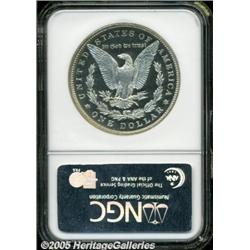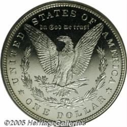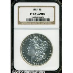 <B>1883<img border='0' src='http://www.heritagecoins.com/images/star.gif' width=10 height=10>$1 PR67 Cameo NGC.</B></I> This is an amazing example of the issue with exceptional eye appeal. The fields have extraordinarily deep mirrors with highly lustrous and sharply defined devices. The obverse has excellent cameo contrast, and the reverse easily qualifies as deep or ultra cameo. The surfaces on both sides are entirely brilliant and untoned. Mint records indicate that 1,039 Proof Morgan Dollars were coined in 1883, and of that total, we cannot envision any finer looking survivors today. NGC has certified three better examples, one each as Proof 67 Ultra Cameo, Proof 68, and Proof 68 Cameo. Could any of those have more eye appeal than this Superb Cameo Proof? We doubt it.