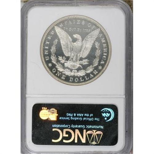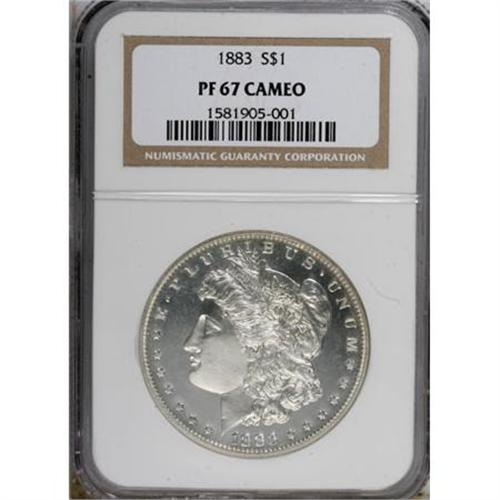 <B>1883 $1 PR67 Cameo NGC.</B></I> Approximately 450 proof 1883 Morgan dollars (1,039-piece mintage) have been certified by NGC and PCGS. The services have assigned the Cameo label to about 50 coins, most of which are in the Select to Gem categories. A mere three PR67 Cameos have been seen, and a solitary piece finer (6/07).<BR> Untoned surfaces on this Superb Cameo exhibit a mild white-on-black contrast, and a powerful strike emboldens all of the design features, enhancing even further the coin's outstanding eye appeal. Close examination reveals no significant marks. For identification purposes, we can only note a barely discernible mark between stars 3 and 4, and another beneath the first A in AMERICA.<BR><BR><b>Shipping:</b> Coins & Currency (<a target="_blank" href="http://www.heritageauctions.com/common/shipping.php">view shipping information</a>\)