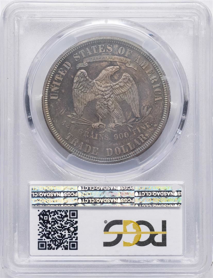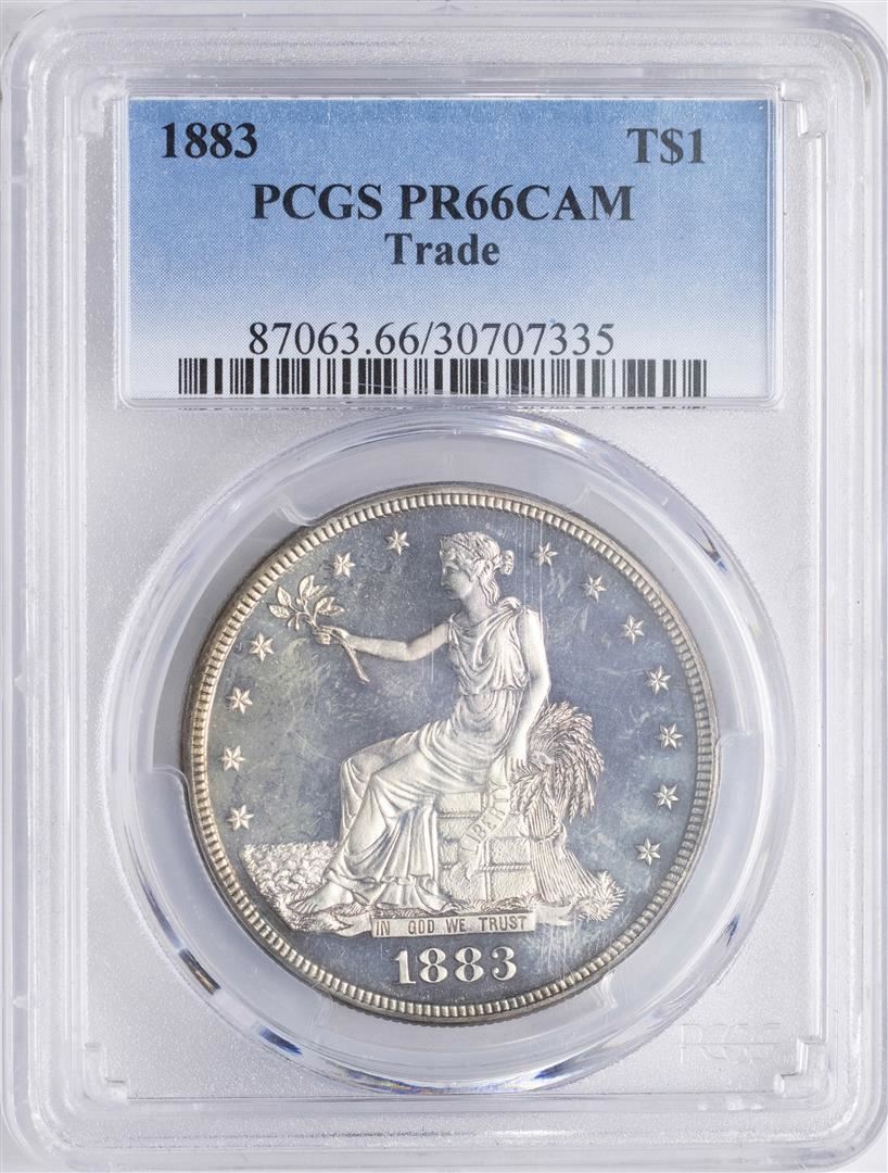 One 1883 $1 Trade Silver Dollar Proof Coin PCGS graded PR66CAM. The Trade dollar continued to be struck on a regular basis in proof format only from 1879 through 1883. Only 979 specimens were produced in that final year. This Gem example is certain to be popular with collectors. PCGS Graded.