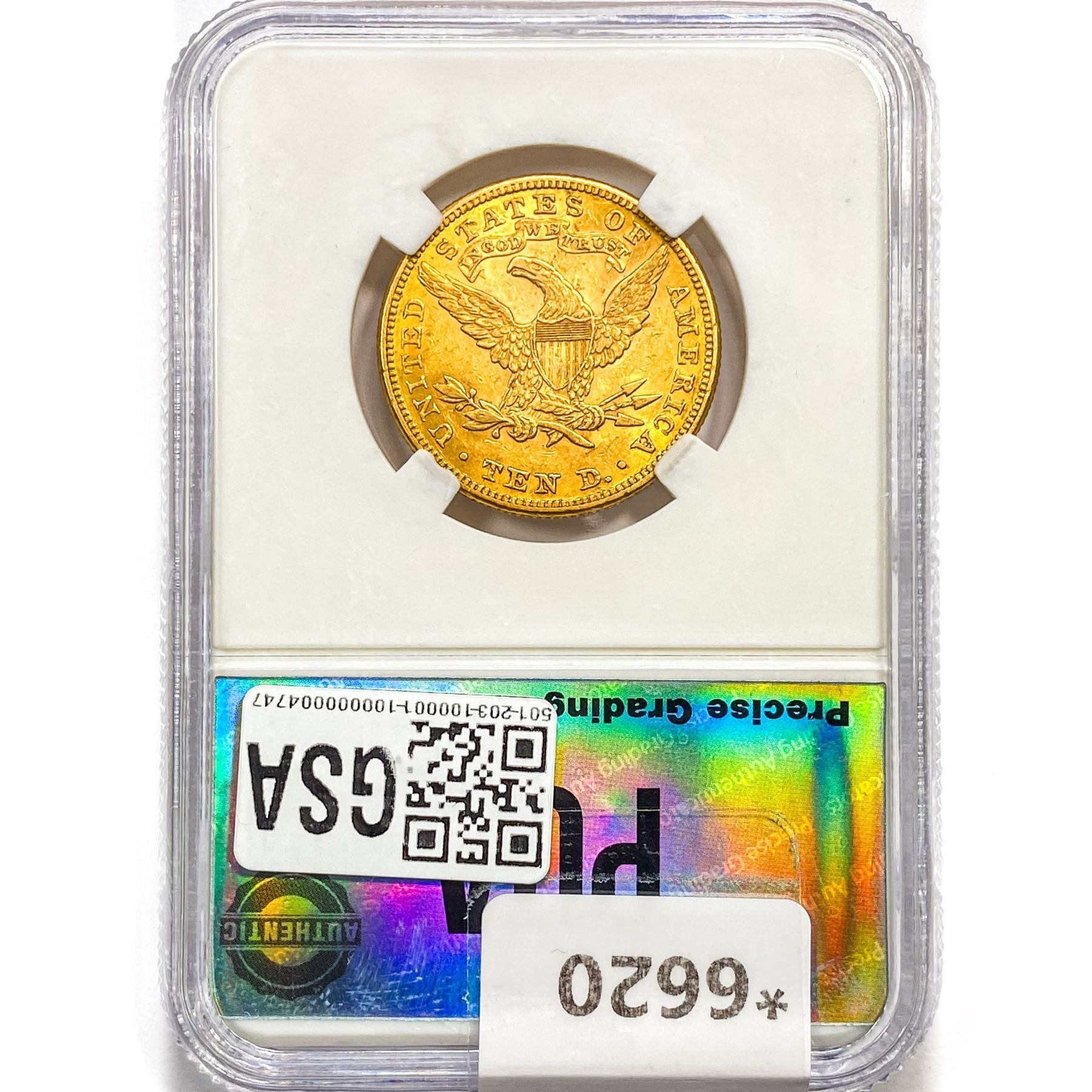 l. All non-certified coins and currency are guaranteed genuine, but are not guaranteed as to grade, since grading is a matter of opinion, an art and not a science, and therefore the description rendered by GSA or any third-party grading service may not agree with the opinion of others (including trained experts), and the same expert may not grade the same item with the same grade at two different times. GSA may, but is not obligated to, express an opinion as to non-certified numismatic items, in GSA's opinion, or by its employees' experience and the current interpretation of the American Numismatic Association's standards as of the date the catalog was prepared. There is no guarantee or warranty expressed or implied that the grading opinions utilized by GSA, if any, will meet the standards of any grading service at any time in the future.
