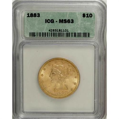 <B>1883 $10 MS63 ICG.</B></I> A lustrous and lightly abraded apricot-gold eagle with a crisp strike. Unlike the P-mint eagles of 1880 to 1882, the 1883 poses a challenge in Select and better grades.<BR><BR><B>Coin Engraver:</B> Christian Gobrecht<BR><BR><b>Shipping:</b> Coins & Currency (<a target="_blank" href="http://www.heritageauctions.com/common/shipping.php">view shipping information</a>)