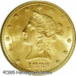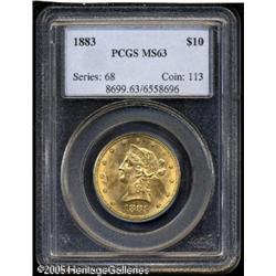 <B>1883 $10 MS63 PCGS.</B></I> A boldly struck representative that has bright cartwheel luster. A small contact mark near Liberty's lower bust is all that prevents an even higher designation. The production of Eagles at the Philadelphia mint was dramatically lower in 1883 than in the two years prior. Population: 51 in 63, 4 finer (12/04).<BR><I>Ex: Heritage 1/00.</B></I><BR><I>From The Richard J. Chouinard Collection of United States Coins, Part Two.</B></I> Lot:8778