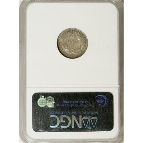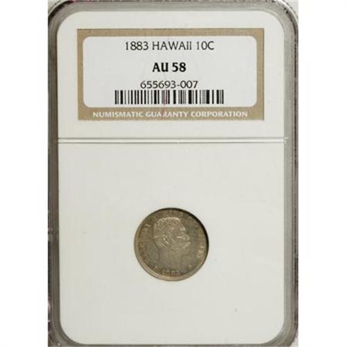 <B>1883 10C Hawaii Ten Cents AU58 NGC.</B></I> Both centers are slate-gray, but the obverse border has golden toning, while the reverse features ocean-blue patina across the periphery. Faint, wispy marks are present in the fields. Unlike most monarchs, David Kalakaua, whose portrait appears on this piece, was elected by a legislature rather than inheriting his title.<BR><BR><b>Shipping:</b> Coins & Currency (<a target="_blank" href="http://www.heritageauctions.com/common/shipping.php">view shipping information</a>)