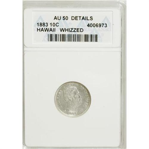 <B>1883 10C Hawaii Ten Cents--Whizzed--ANACS. AU50 Details.</B></I> NGC Census: (11/160). PCGS Population (46/207). Mintage: 250,000. (#10979)<BR><BR><b>Shipping:</b> Coins & Currency (<a target="_blank" href="http://www.heritageauctions.com/common/shipping.php">view shipping information</a>)