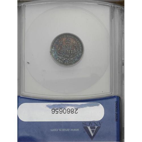 <B>1883<10C> Hawaii Ten Cents MS62 ANACS.</B></I> Variegated cobalt-blue and lavender toning bathes each side of this Hawaiian dime, and the design elements are well impressed. A couple of light abrasions are noted on the face of the obverse portrait. Surface luster is somewhat subdued.