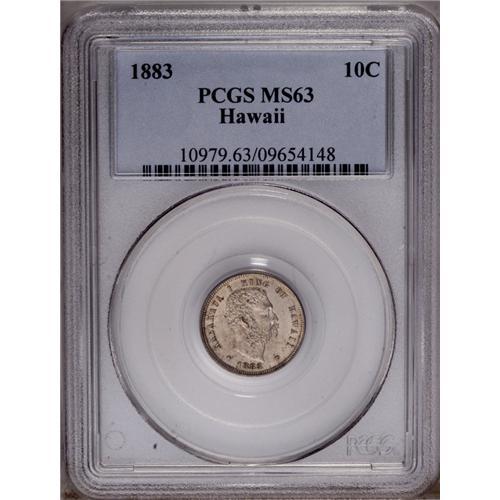 <B>1883<10C> Hawaii Ten Cents MS63 PCGS.</B></I> A fine example of what the U.S. Mint can produce even for foreign territories, this being a sharply produced and nicely defined coin, with handsome medium gray surfaces still broadcasting satiny luster. Several dark spots serve to limit the grade. Population: 26 in 63, 46 finer (2/06).