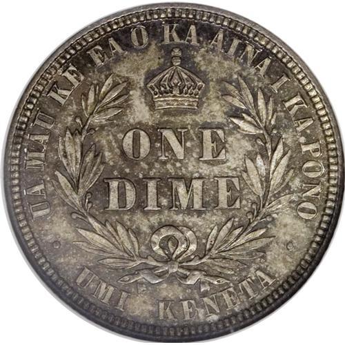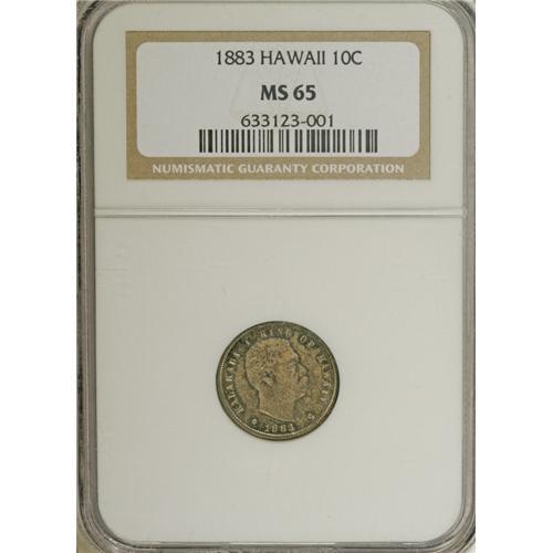 <B>1883 10C Hawaii Ten Cents MS65 NGC.</B></I> Autumn-brown and ice-blue congregate embrace this well struck and prooflike Gem. The glossy surfaces are unabraded, and the eye appeal is irrefutable. This one-year type has a reported mintage of 250,000 pieces, but many were likely melted after Hawaii became a U.S. territory. Census: 12 in 65, 6 finer (2/07).<BR><BR><b>Shipping:</b> Coins & Currency (<a target="_blank" href="http://www.heritageauctions.com/common/shipping.php">view shipping information</a>)