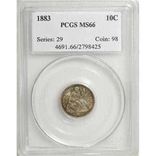 <B>1883 10C MS66 PCGS.</B></I> Warm reddish-orange toning visits the margins, while the shining centers offer emerald patina. Incredible eye appeal with just a hint of frost on the highpoints. PCGS has certified 10 finer pieces (1/08).<BR><BR><B>Coin Engraver:</B> Christian Gobrecht<BR><BR><b>Shipping:</b> Coins & Currency (<a target="_blank" href="http://www.heritageauctions.com/common/shipping.php">view shipping information</a>)