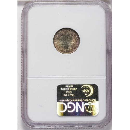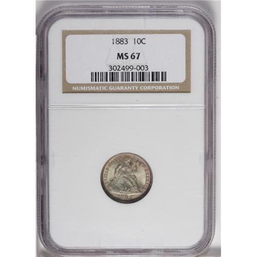 <B>1883<10C> MS67 NGC.</B></I> Rose-red fills the wreath and obverse legends, while the centers are bathed in rich lime-green patina. The overall strike is bold. This lustrous and nearly immaculate Superb Gem has a few tiny mint-made planchet flaws above the bow. Census: 21 in 67, 1 finer (9/06).