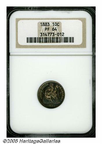 <B>1883<10C> PR64 NGC.</B></I> This proof Seated dime is awash with splashes of cobalt-blue, golden-brown, and lavender patina, and exhibits sharply struck motifs. A few wispy hairlines in the fields do not detract.