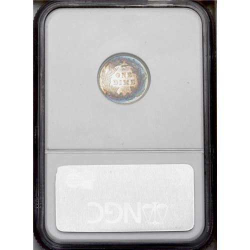 <B>1883<10C> PR64 <img border='0' src='http://www.heritagecoins.com/images/star.gif' width=10 height=10> NGC.</B></I> Vibrant electric-blue and plum bands encompass lightly toned centers. Suitably struck, and only a few hairlines are detected on the right obverse field. One of only two proof 1883 dimes to receive a Star designation (for superior eye appeal) from NGC.<BR><I>From The Lewis (Tahoe) Collection.</B></I>
