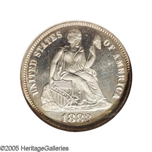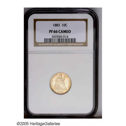 <B>1883<10C> PR66 Cameo NGC.</B></I> Not only is this glittering representative in a remarkable state of preservation, its eye appeal is absolutely top notch. Attractive golden-tan patina circles the borders on each side. The fields are deeply mirrored and the devices are nicely frosted. Only a tiny percentage of the 1,039 proofs issued could possibly survive this nice. Census: 4 in 66, 6 finer (11/05).