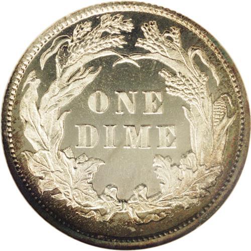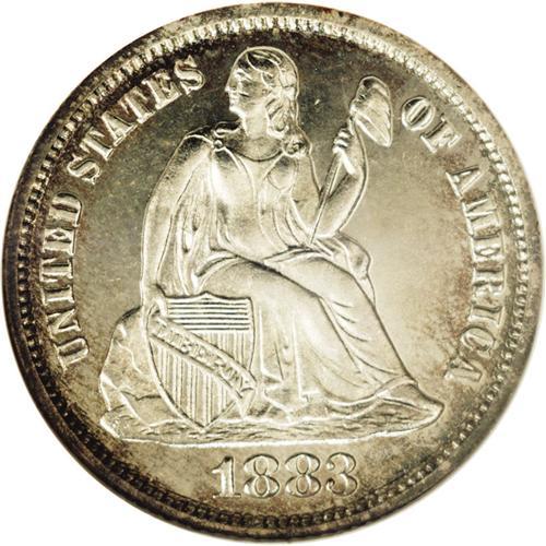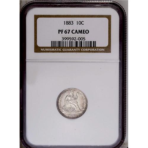 <B>1883<10C> PR67 Cameo NGC.</B></I> Icy-white devices contrast with flashy, undisturbed mirror fields. Subtle apple-green and tan freckles visit the borders. Unlike quarters and half dollars, dimes were struck in quantity in 1883. Nearly pristine proofs, however, are both rare and desirable. Census: 5 in 67 Cameo, 1 finer (2/06).