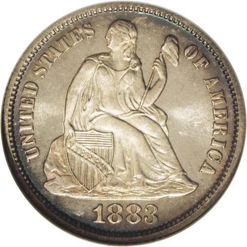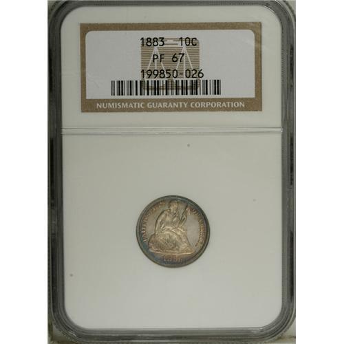 <B>1883 10C PR67 NGC.</B></I> The obverse of this Superb proof dime is mostly brilliant, with mirrored fields contrasting nicely with frosty devices within a framework of vivid target toning. On the reverse, mauve patina lies within cobalt blue peripheries. The surfaces are smooth, in line with the grade, with only a couple of light grazes near the knees being noted for identification purposes. Census: 10 in 67, 4 finer (11/06).<BR><BR><b>Shipping:</b> Coin/Currency (<a target="_blank" href="http://www.heritageauctions.com/common/shipping.php">view shipping information</a>)