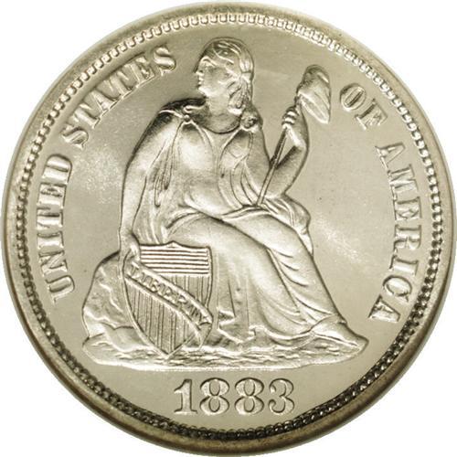 <B>1883 10C PR68 Cameo NGC.</B></I> The white on black contrast is exemplary, but apparently not sufficient to receive an Ultra Cameo designation from NGC. This gorgeously preserved and brilliant piece is crisply struck aside from the lower left corner of the rock, and opposite on a few cereal grains. A minute spot of PVC is on the reverse at 10:30.