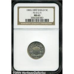 <B>1883/1883<5C> MS63 NGC.</B></I> FS-012.9. The date is widely repunched, visible below the bases of the 8s in the date. Wisps of golden-brown patina visit this lustrous, boldly struck, and impressively unabraded silver-gray example. <BR><BR><B>Important notice:</B> Heritage usually auctions material at the rate of 200-250 lots per hour. On some occasions eBay Live bid software or the Internet may not be able to keep up with the pace of the auction. We recommend placing a realistic absentee bid now as insurance to avoid disappointment. Occasionally the auctioneer may eliminate or reject an eBay Live bid, and the auctioneer may also reopen a lot after the close of the eBay live bidding (usually because we missed an audience bid), and may reject your bid even if it shows you as the winning bidder. By bidding via eBay Live, you agree that Heritage may award the lot to another bidder at its sole discretion under the circumstances described above or any other reasonable circumstances. Since eBay bids are not shown to us until we open the lot on the floor, we treat those bids just like floor bids. In most cases the floor responds before the eBay bid is presented to us, due to Internet lag time, so for consistency we have made it a policy that floor bids are always considered first over tie eBay live bids. Also please note that all Heritage lots purchased through eBay Live carry a 20% Buyer's Premium. Please make sure you read the Terms and Conditions before you bid.