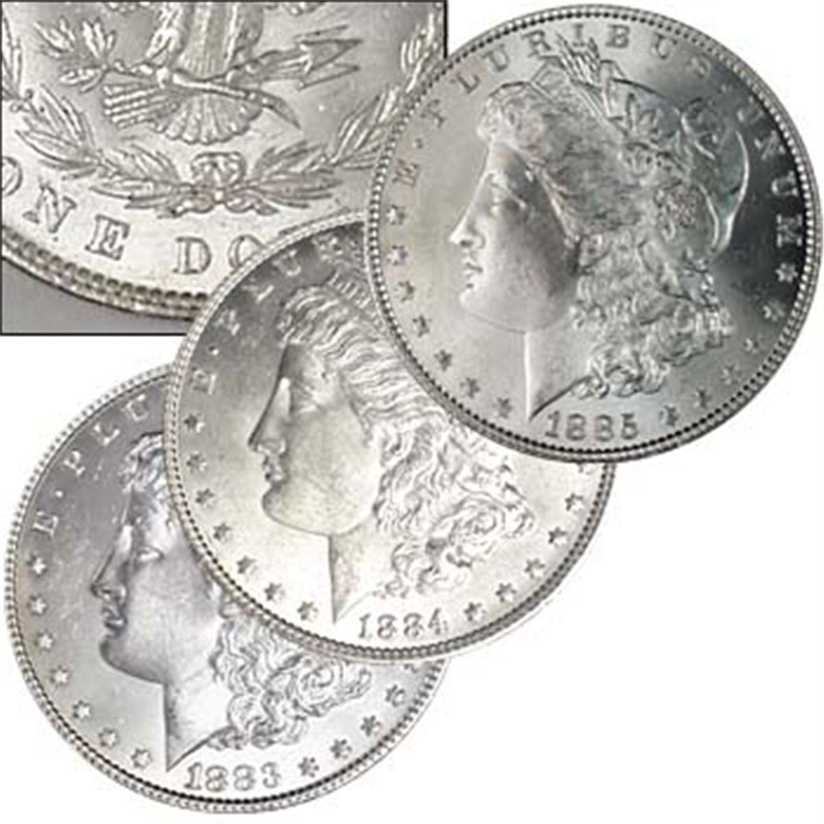 Silver was still pouring out of the great Western mines when the principal Philadelphia Mint struck these no-mintmark 1883, 1884 and 1885 Morgan silver dollars for circulation. But a large proportion was held in reserve at banks and theTreasury. And huge numbers of those were lost forever in U.S. government melts during the world wars. Today as little as 3% of original mintages are estimated to survive in the beautiful Brilliant Uncirculated quality we offer.38.1mm