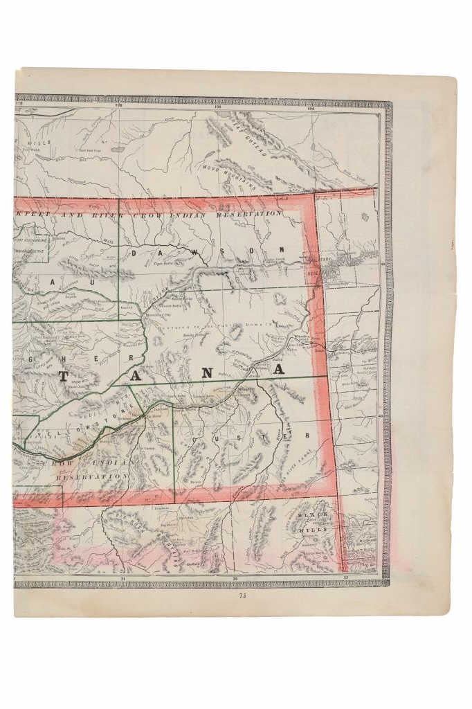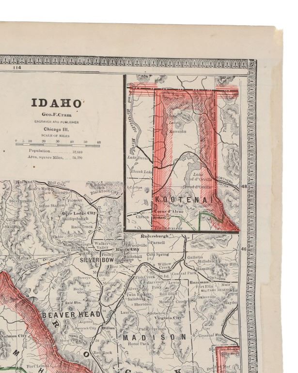 For your consideration in this lot is a two sided map with Idaho Territory on one side, portions of Montana Territory, Wyoming Territory and Dakota Territory on the other. Montana was admitted into statehood in 1889, Idaho and Wyoming the following year. The maps were made by Geo. F. Cram Engraver and Publisher Chicago Ill. The maps show Montana pre 1883-1885, as they do not show Park County (formed on February 23, 1887). George Franklin Cram (1842-1928) was an American map publisher of the George F. Cram Co. which became a leading map firm in the United States. The best known atlas began as The Standard Atlas of the United States which eventually was renamed the Unrivaled Family Atlas which ran for dozens of editions over many decades. His was one of the first American firms to publish a world atlas. The maps are on 11"W X 13.5"L paper that is folded to 5"W X 11"L. Age tanning and slight foxing observed.