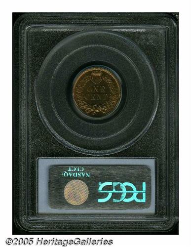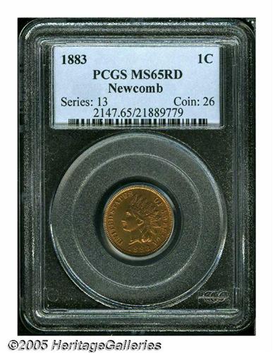 <B>1883<1C> MS65 Red PCGS.</B></I> Ex: Newcomb. Outstanding from a technical viewpoint, this crisply struck Gem has good luster and no marks or carbon of remote consequence. The obverse has fire-red and peach color, the reverse offers lighter straw-gold hues. The ERIC in AMERICA is somewhat rough, as made from a strike-thru.