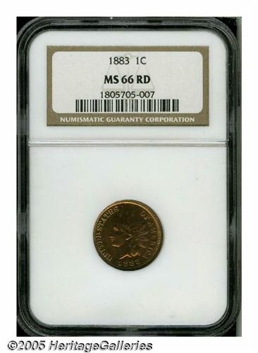 <B>1883<1C> MS66 Red NGC.</B></I> Beautiful rich orange color fills the centers, while canary-gold hues dominate the margins. The obverse is especially close to immaculate. Well struck from a technical perspective, although the dies are late state and provide somewhat blurry definition. Population: 19 in 66, 3 finer (3/05).