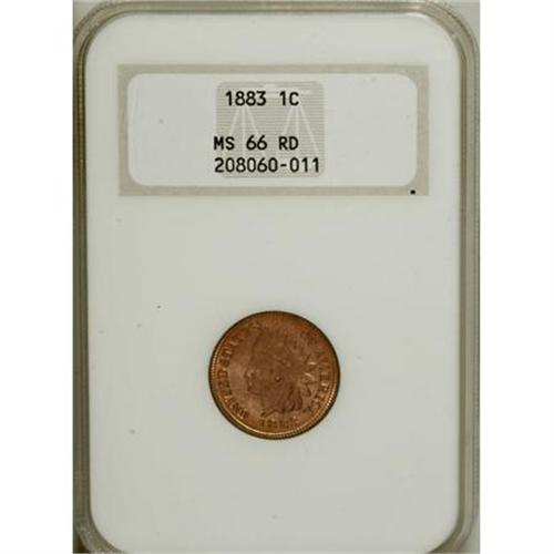 <B>1883 1C MS66 Red NGC.</B></I> A lustrous cherry-red Premium Gem with remarkably uniform color and a carbon-free appearance. Minor contact on the cheek denies technical perfection. A common date, but uncommon in such exemplary quality. Certified in a prior generation holder. Census: 18 in 66 Red, 3 finer (8/07).<BR><BR><B>Coin Engraver:</B> James B. Longacre<BR><BR><b>Shipping:</b> Coins & Currency (<a target="_blank" href="http://www.heritageauctions.com/common/shipping.php">view shipping information</a>)