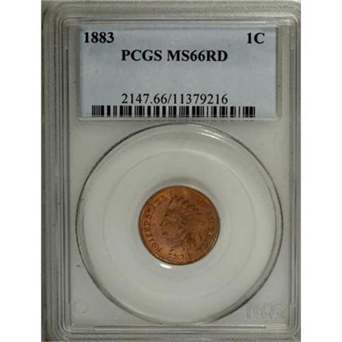 <B>1883 1C MS66 Red PCGS.</B></I> Well struck and lustrous, with lovely orange, rose, and sky-blue shades and exquisitely preserved surfaces. This alluring Premium Gem displays bold detailing on most of the design elements. A few pinpoint flecks appear with the aid of a loupe. Population: 22 in 66 Red, 7 finer (6/07).<BR><I>From The Santa Fe Collection, Part Two.</B></I><BR><BR><B>Coin Engraver:</B> James B. Longacre<BR><BR><b>Shipping:</b> Coins & Currency (<a target="_blank" href="http://www.heritageauctions.com/common/shipping.php">view shipping information</a>)