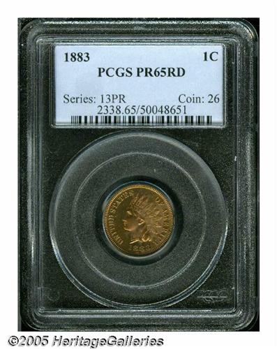 <B>1883<1C> PR65 Red PCGS.</B></I> Simply eye-catching red color with bright violet and yellow color in the reflective fields, especially the reverse. Some tiny toning spots, but virtually perfect, as expected for a Gem coin.