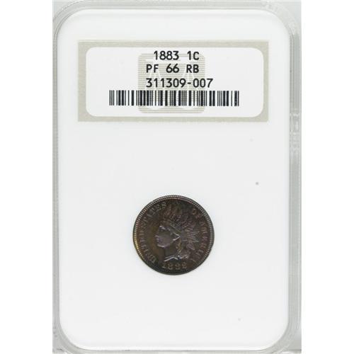 <B>1883 1C PR66 Red and Brown NGC.</B></I> Minor proof sets for 1883 included the last issue of the Shield nickel, the Liberty Head No Cents and With Cents nickels, and the Indian cent. This piece offers lustrous, sharp purple-blue surfaces. In an old-style NGC holder. Census: 33 in 66 Red and Brown, 4 finer (4/07).<BR><BR><b>Shipping:</b> Coins & Currency (<a target="_blank" href="http://www.heritageauctions.com/common/shipping.php">view shipping information</a>)