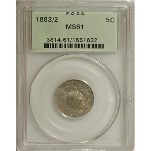 <B>1883/2 5C MS61 PCGS.</B></I> FS-013.2. Considering that four different <I>Cherrypickers'</B></I> obverse varieties constitute the 1883/2, this overdate is surprisingly rare in Mint State. Blushes of chestnut-brown grace this satiny and generally smooth example. Certified in a green label holder.<BR><BR><B>Coin Engraver:</B> James B. Longacre<BR><BR><b>Shipping:</b> Coins & Currency (<a target="_blank" href="http://www.heritageauctions.com/common/shipping.php">view shipping information</a>)