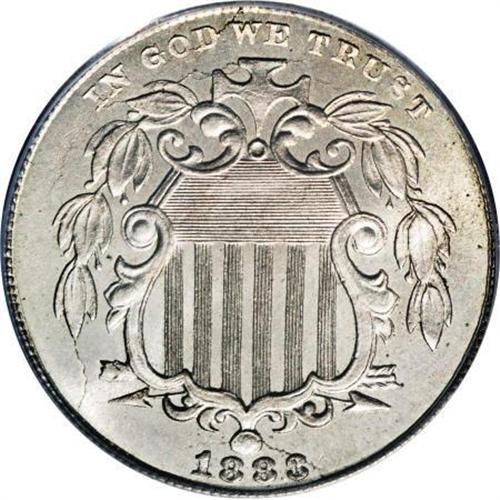 <B>1883/2 5C MS64 PCGS.</B></I> FS-013.1. One of four varieties known of overdate for 1883. This one shows the bottom curve of the 2 just to the left of the 3. There is also a distinctive die crack that begins to the right of the date, goes through the ball, and terminates above the left side of the 1. The surfaces are untoned with satiny mint luster. Sharply struck. There is just the slightest sprinkling of carbon that prevents an even higher grade. <BR><I>From The John Stimson, Sr. Collection, Part Two.</B></I><BR><BR><B>Coin Engraver:</B> James B. Longacre<BR><BR><b>Shipping:</b> Coins & Currency (<a target="_blank" href="http://www.heritageauctions.com/common/shipping.php">view shipping information</a>)