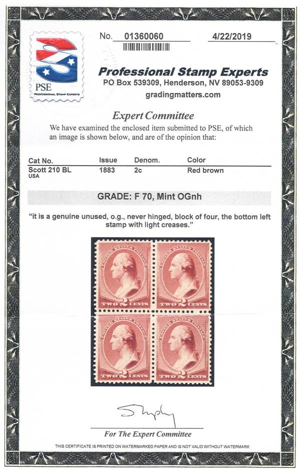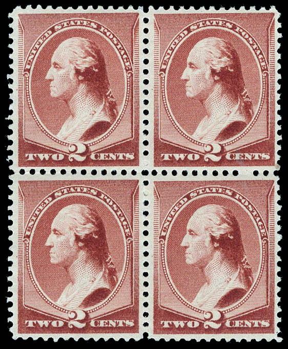 1883, 2¢ Washington, red brown. Scott 210. Bottom left stamp with light creases, otherwise F-VF