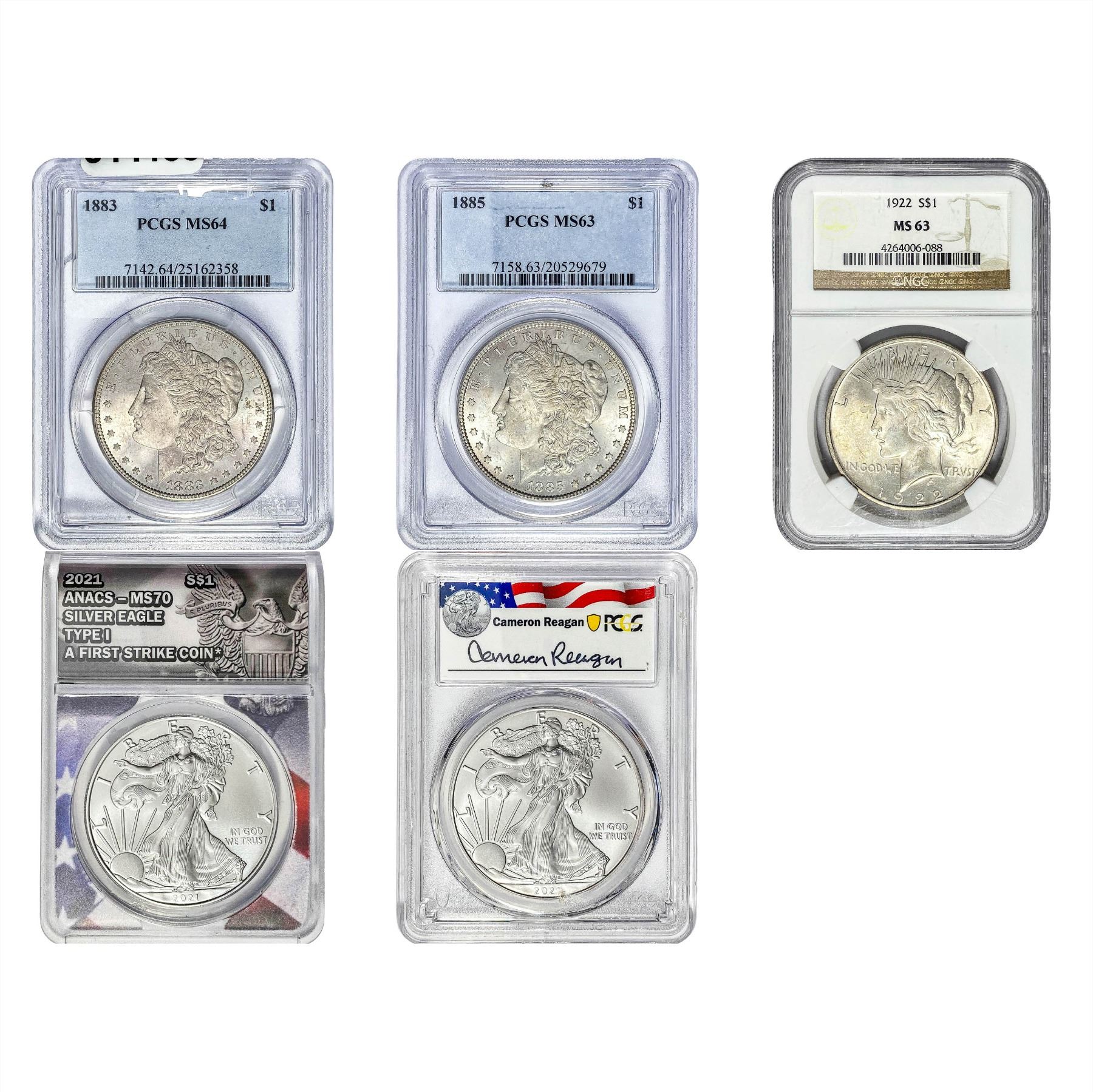 1883-2021 GEM BU US Silver Dollar Lot [5 Coins] PCGS/NGC/ANACS MS63-70