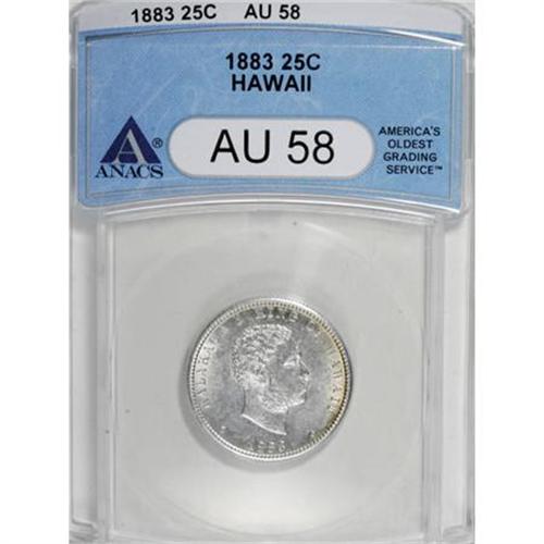 <B>1883 25C Hawaii Quarter AU58 ANACS.</B></I> NGC Census: (50/531). PCGS Population (85/907). Mintage: 500,000. (#10987)<BR><BR><b>Shipping:</b> Coins & Currency (<a target="_blank" href="http://www.heritageauctions.com/common/shipping.php">view shipping information</a>)