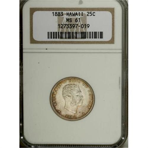 <B>1883 25C Hawaii Quarter MS61 NGC.</B></I> . NGC Census: (23/538). PCGS Population (49/907). Mintage: 500,000. (#10987)<BR><BR><b>Shipping:</b> Coins & Currency (<a target="_blank" href="http://www.heritageauctions.com/common/shipping.php">view shipping information</a>)