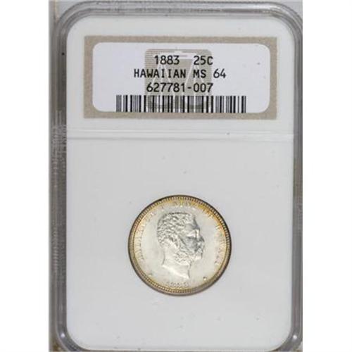 <B>1883 25C Hawaii Quarter MS64 NGC.</B></I> Sharply detailed with exceptional eye appeal, this brilliant example has prooflike fields, sharp design elements, and peripheral iridescence. Splashes of darker color are evident on the reverse.<BR><BR><b>Shipping:</b> Coins & Currency (<a target="_blank" href="http://www.heritageauctions.com/common/shipping.php">view shipping information</a>)