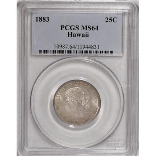<B>1883 25C Hawaii Quarter MS64 PCGS.</B></I> Hazy silver-gray patina overall with hints of rose-gold at the margins. This well-defined Choice piece offers an excellent opportunity to acquire a high-end example of Hawaiian silver coinage.<BR><BR><b>Shipping:</b> Coins & Currency (<a target="_blank" href="http://www.heritageauctions.com/common/shipping.php">view shipping information</a>)