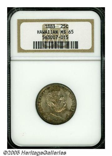 <B>1883<25C> Hawaii Quarter MS65 NGC.</B></I> Splashes of ocean-blue and russet-brown toning embrace this lustrous and well struck Gem. A lovingly preserved example of this one year type. The first 8 in the date is recut.