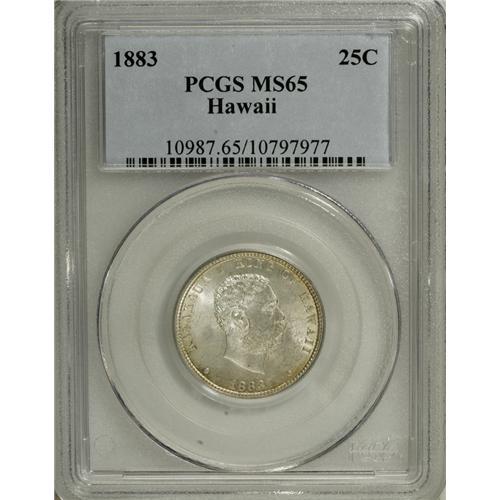 <B>1883 25C Hawaii Quarter MS65 PCGS.</B></I> Highly lustrous with a trace of gold-orange patina at the rims. The remainder of this piece is well-preserved and essentially untoned.<BR><BR><b>Shipping:</b> Coins & Currency (<a target="_blank" href="http://www.heritageauctions.com/common/shipping.php">view shipping information</a>)